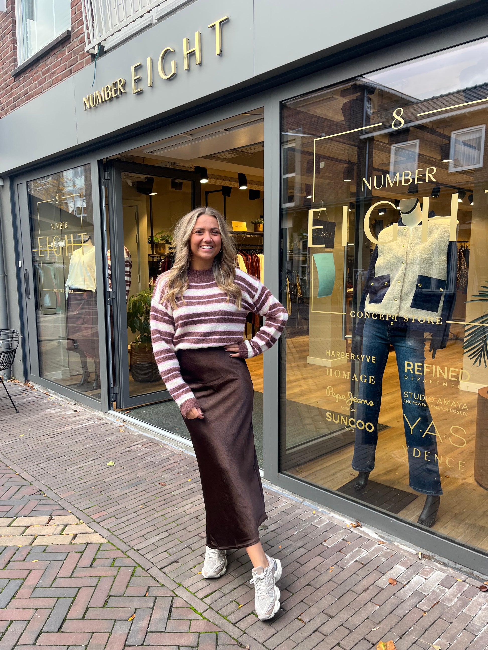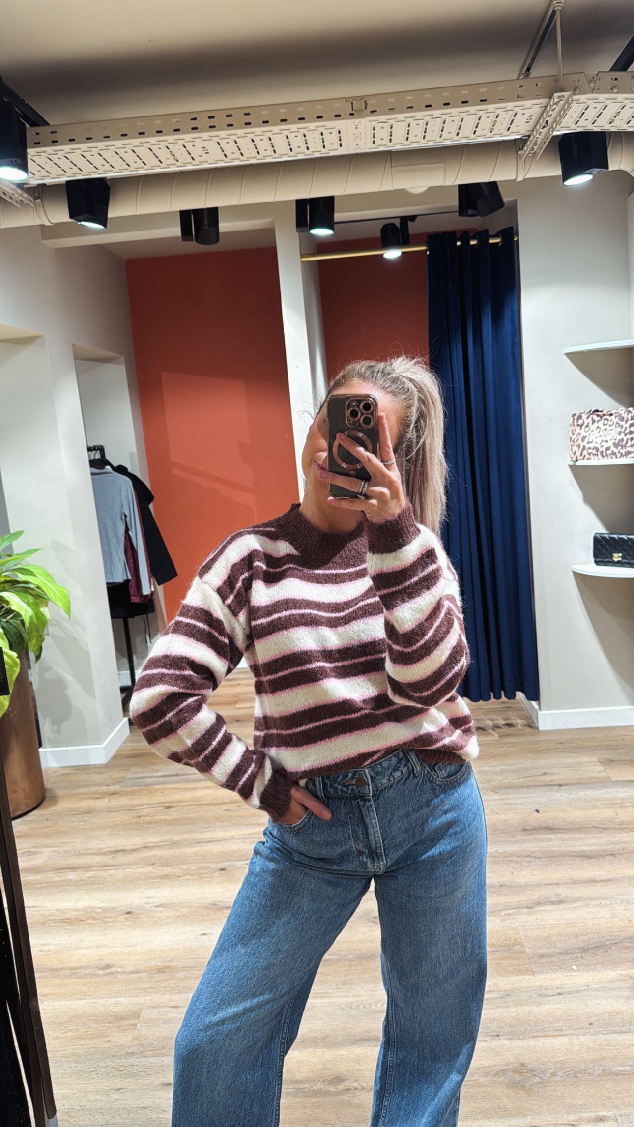 Streep trui in de trendkleuren van dit najaar. De trui bevat 6% wol
