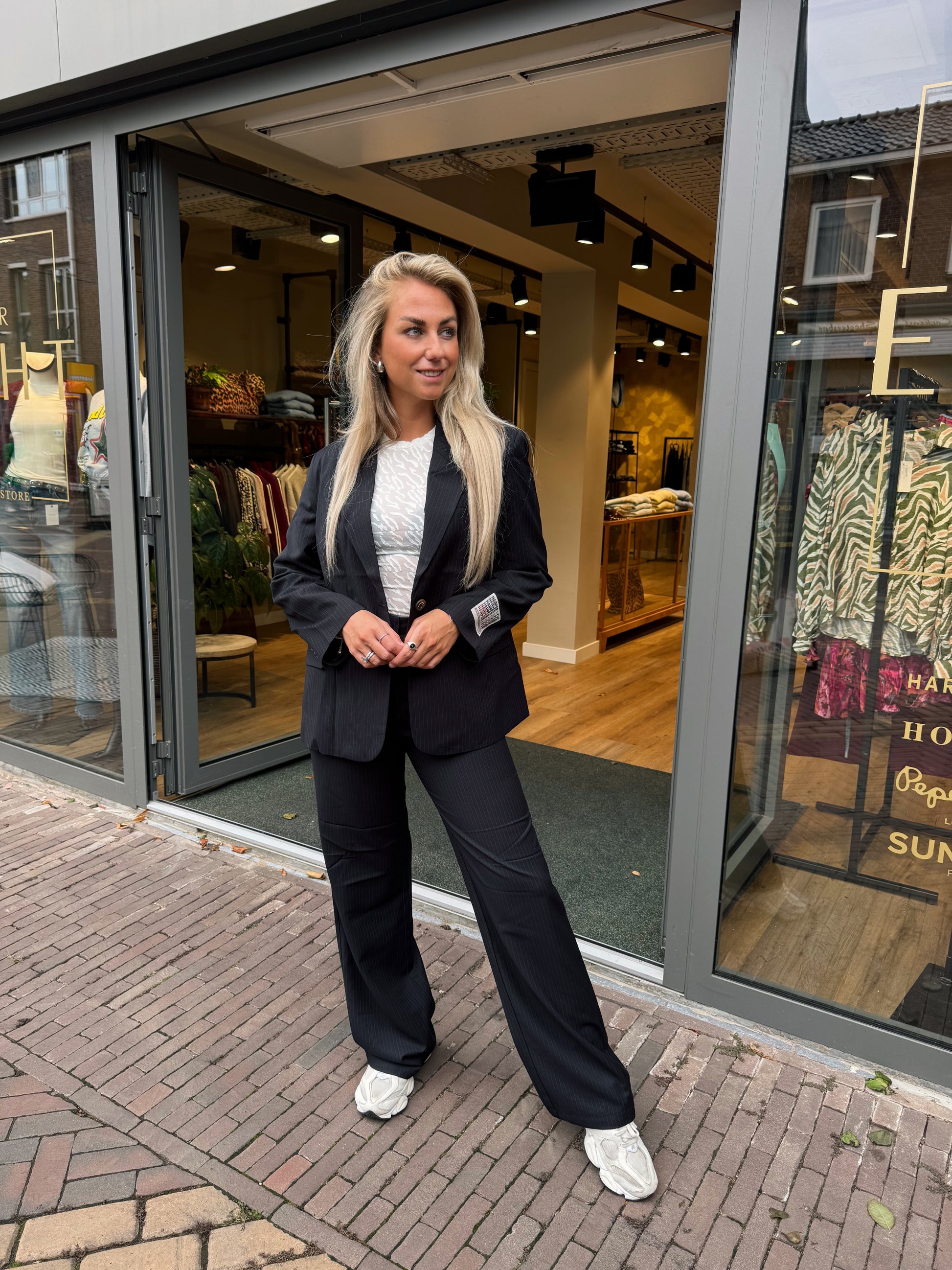 Een pantalon met een hele mooie fit, subtiele krijtstreep maar weinig stretch.