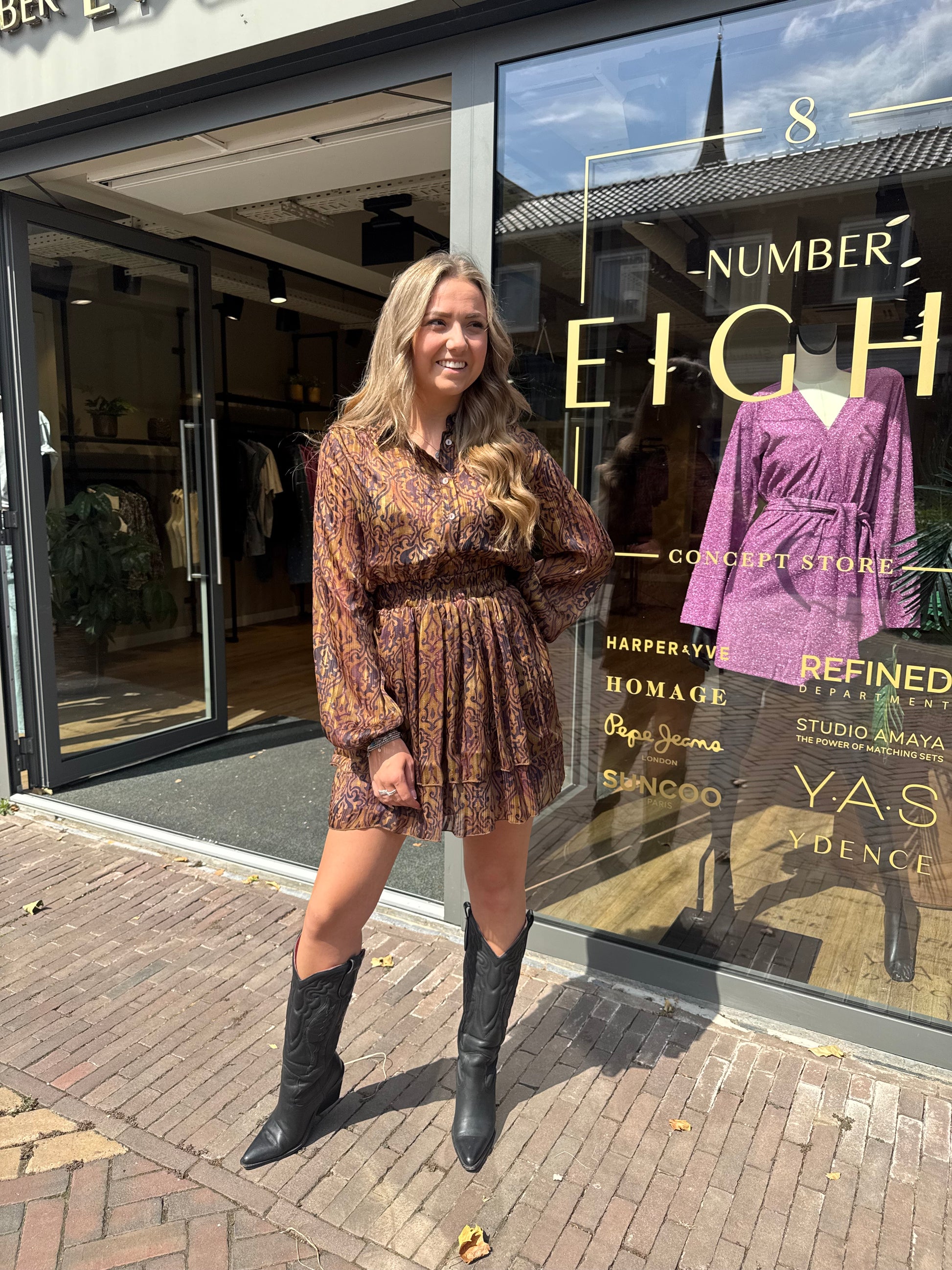 De Indy Blouse is uniek door de all over print, waar kleuren paars, donkerblauw, oker en veel meer in terug komen. De blouse heeft knoopjes aan de voorkant. Sierlijke plooiende mouwen. En een normale lengte. Er komt een topje bij de blouse geleverd.