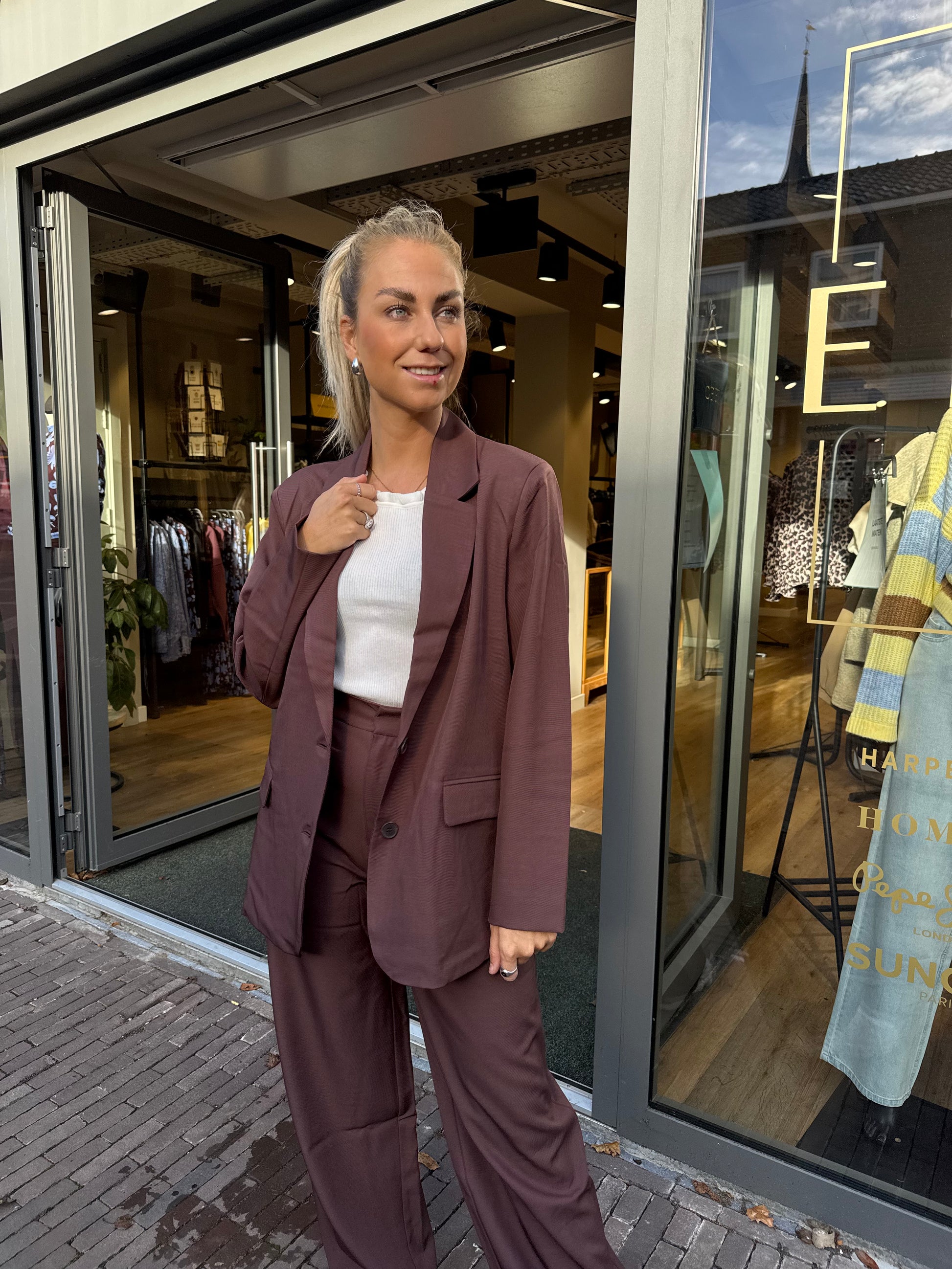 De blazer is een oversized fit. We hebben ook een bijpassende pantalon in de collectie.