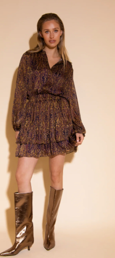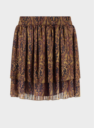 De Jill Skirt in een korte rok, waar kleuren paars, donkerblauw, oker en veel meer in terug komen. De Korte rok heeft een elastische tailleband, dit zorgt voor een breder pasbereik en een comfortabele pasvorm. Oneraan twee lagen die uitlopen in ruches.