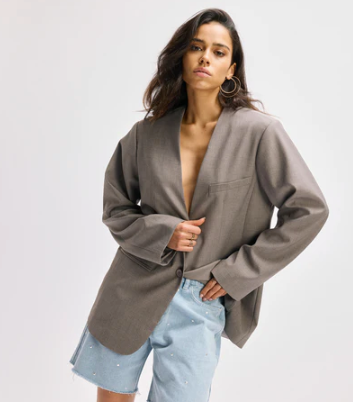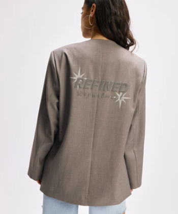 Oversized grijze blazer met back print. Deze blazer heeft geen revers waardoor de hals voorzijde heel mooi aansluit. Deze blazer kun je ook heel leuk stylen met een taille riempje