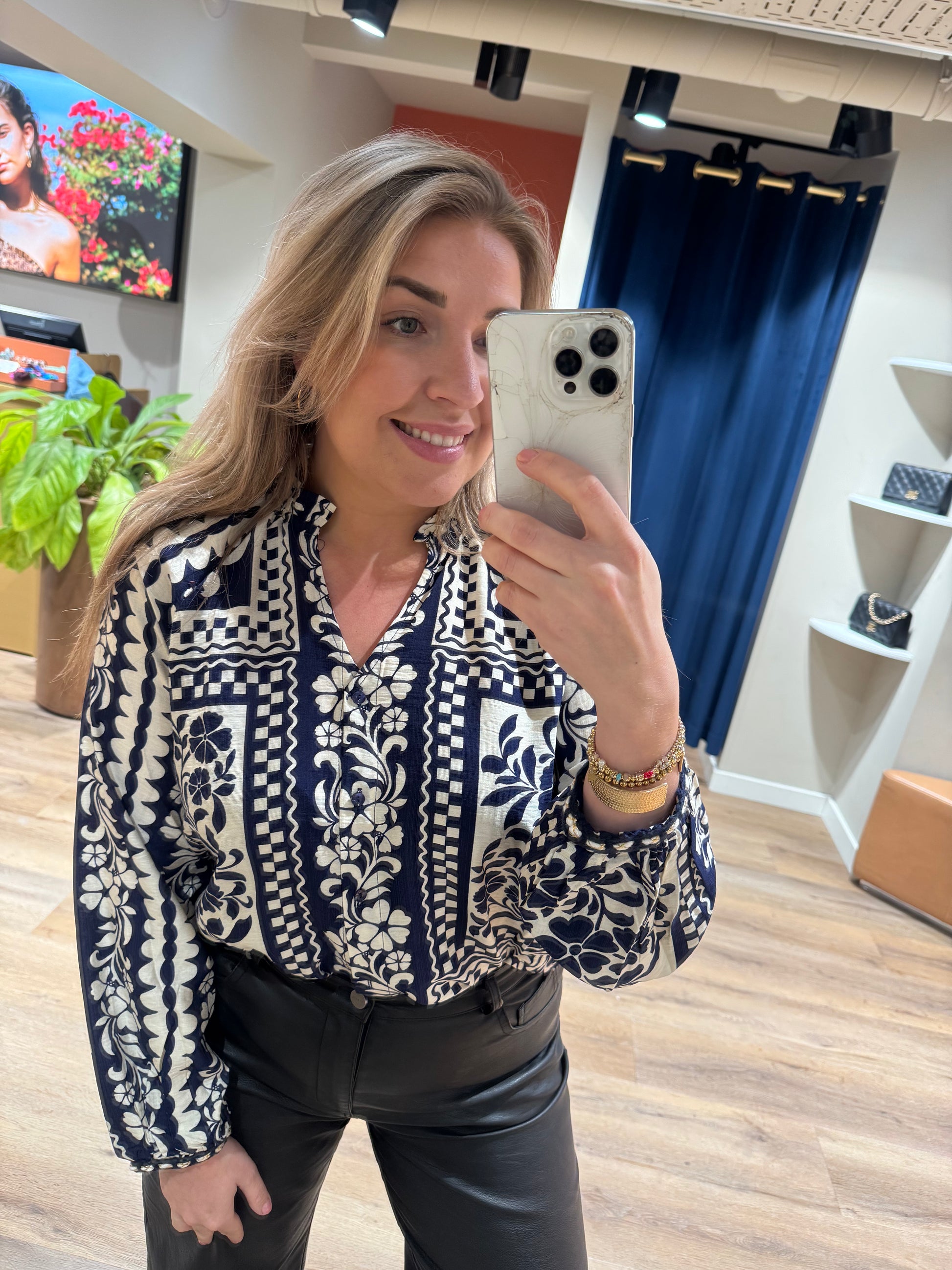 Deze blouse van 100% viscose voelt heerlijk luchtig en soepel aan — ideaal voor zowel werk als vrije tijd. Het losvallende model zorgt voor een elegante, ontspannen look, terwijl de blauw-witte print makkelijk te combineren is met denim, wit of beige. Een echte allrounder die in geen enkele garderobe mag ontbreken!