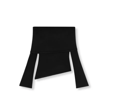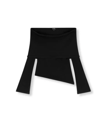 Gebreide aangesloten off shoulder top. Top heeft een leuk a-symetrisch effect